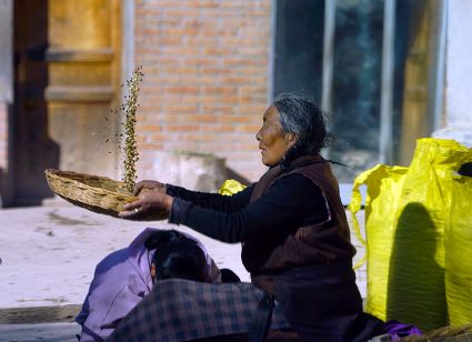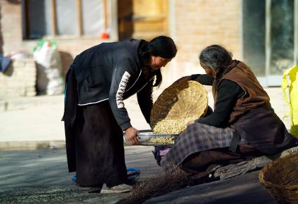 一群孩子會準(zhǔn)時(shí)來小二樓叫我,要去密林,要去山岡,要去尋找?guī)в薪?jīng)文的瑪尼石,還要去那個(gè)神秘的洞頂。比孩子們更準(zhǔn)時(shí)的是掛在小二樓上的四個(gè)大喇叭,鳥雀剛醒來,廣播就開始了,就必須要起來了。穿過巷道,和打豆子的人們一起享受勞動的幸福。我們在一起,等待著下午的廣播,因?yàn)閺V播會給我們帶來無盡的喜悅。