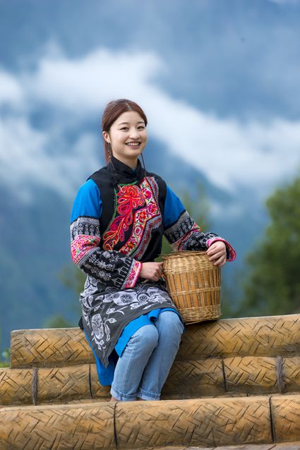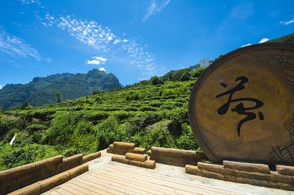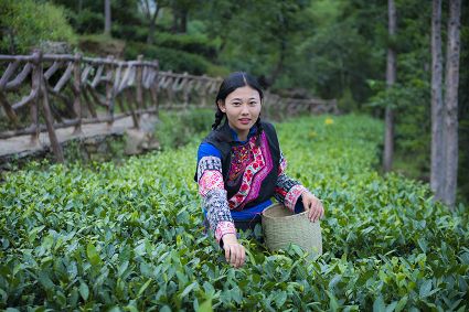 待日上三竿,陽光斜射穿越云霧,采茶姑娘身著客家服,藍(lán)黑格調(diào),綴以手繪圖紋,頭戴角形斗笠。嫣然而笑。瞬間清潤心間,討一捧新茶至云上茶居,沏茶邀友。