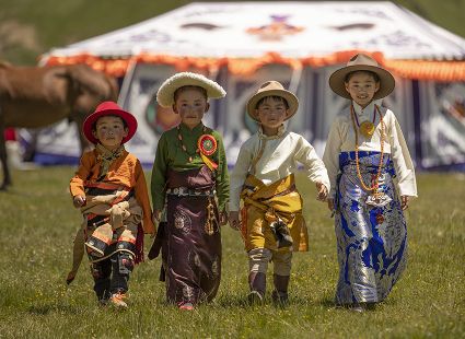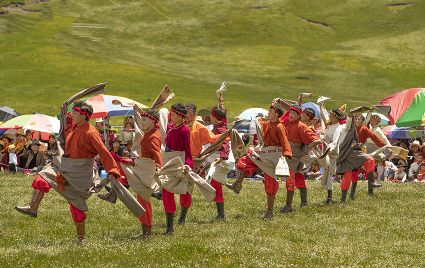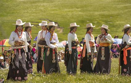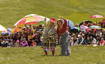 據(jù)說早在吐蕃時期,人們以村寨為單位,在本教僧人的帶領下高舉幡桿,手拿青棵、麥穗,繞田間地頭轉圈,祈禱神靈保佑,獲得豐收。儀式結束后,就在草場上展開角斗、斗劍、耍梭標等活動。格魯派興起后,這一活動仍得到保留,只是在繞地巡游時,人們要舉佛像、背經(jīng)文,文體活動也增加了賽馬、射箭、馬術、藏戲、民間歌舞等內容。解放后,革去了繞地巡游等一些宗教儀軌,增加了許多休閑娛樂、物資交流的內容。“望果節(jié)”沒有固定日期,各地根據(jù)農事而定,一般在秋收前(8月)擇吉日舉行,時間1-3天。