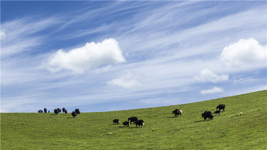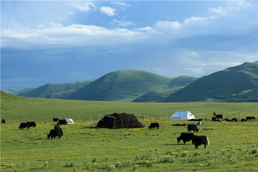 在康定,塔公草原草色青青,引得往來的游人駐足,藍(lán)天、白云、青草地,幾匹悠閑吃草的牛羊,一幅草原美景圖呈現(xiàn)在眼前,讓人流連。