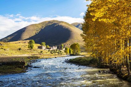 光影如此柔和,秋色如此美麗。夏去秋來,綠草不再成為主調(diào)。紅色、褐色和黃色充斥在眼底,五彩斑斕盡顯秋色,就像油畫一樣美輪美奐。再加上碧綠清澈的河流,彎彎曲曲,流淌走過四季,和著暖陽牛馬悠閑懶散的身影,自然天成的美景令人心曠神怡、如醉如癡……