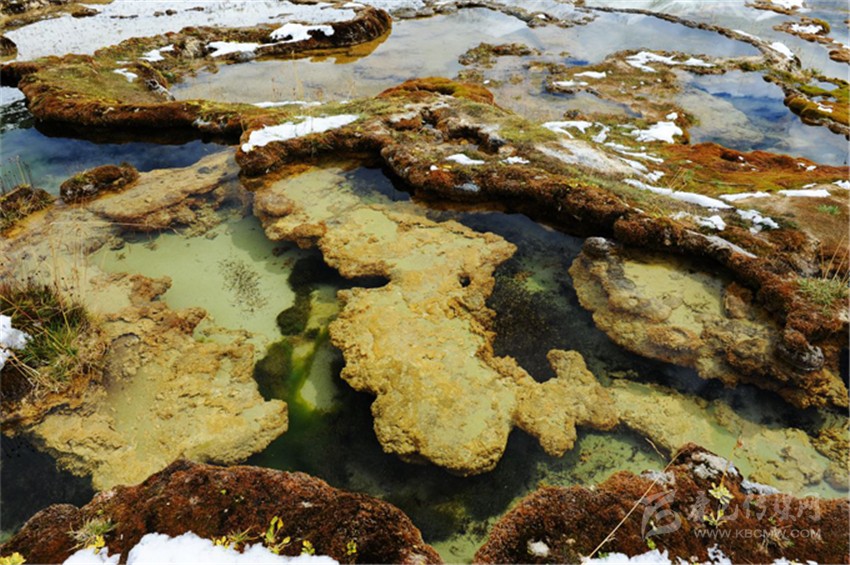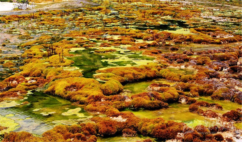 灘長約3000米,寬約200米,共有7個(gè)臺(tái)階,上面形成了大小不一的彩池,里面的各類水生植物,暢游的羌活魚(小鯢)等,給這片古老的地質(zhì)奇觀帶來了無限的生機(jī)。在海拔4300米處,有一眼噴出1.5米高的溫泉,水溫常年在30度左右,是玉龍泉華灘的主要水源。