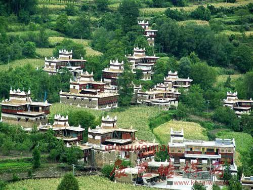 甲居藏寨象群星撒落般坐落在依山傾斜,起伏向上的緩坡上?;蛐锹淦宀迹虺砻芗?,或在高山懸崖上,或在河壩綠茵間,不時炊煙裊裊,煙云繚繞,搖搖晃晃,若幻若真,真可謂“別有天地非人間。藏寨對岸,但見萬丈絕壁凌空筆立,縱橫連綿的群峰象征一幅幅看不盡的畫廊,每座山峰都有一個美麗動人的神話故事。