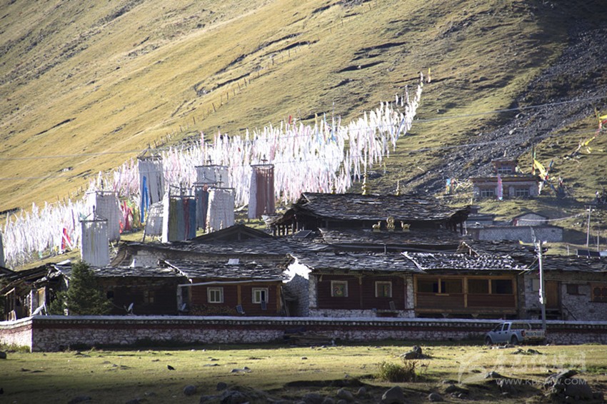 當(dāng)太陽落進(jìn)金龍雪山的懷抱,最后一抹余暉斜照在靜靜的莫斯卡村莊上。東邊的小河在斜陽里歡快的流過村莊,莫斯卡的女人在夕陽里,正領(lǐng)著孩子回家。西邊牧歸的男人悠閑的向山下趕著牦牛。村莊背后漫山的經(jīng)幡,在晚風(fēng)里誦經(jīng)祈福……格薩爾王的傳說就在這樣的時光里,雕琢成了漫山的石刻,在經(jīng)年的歲月里傳頌。