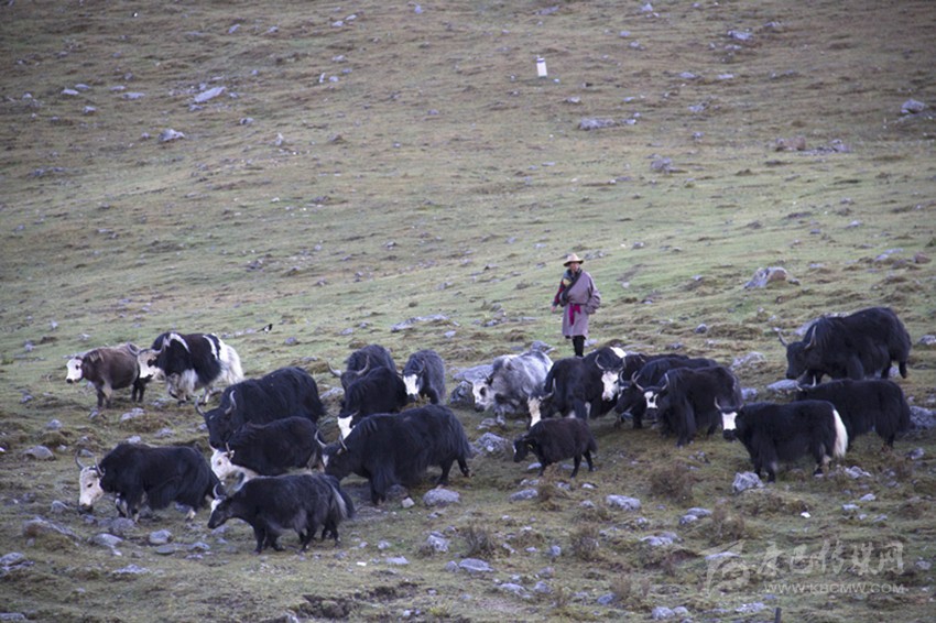 正直初秋,草坪被這個季節(jié)染成了淺褐色。草地上牦牛和馬匹成群,悠閑的啃著草地現(xiàn)存的幾抹綠意。
