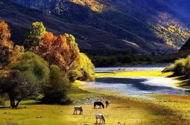 秋季,是稻城亞丁最具有詩意的季節(jié)?;鸺t、金黃、碧藍(lán)是自然這位大藝術(shù)家收藏已久最珍貴的顏料,這瞬間被洋洋灑灑潑灑在這天地之間。無論從什么角度看,取景框永遠(yuǎn)是一幅美麗的畫面。