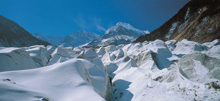 海螺溝地處橫斷山系的核心地帶,境內(nèi)延綿著眾多終年積雪、冰清玉潔的雪山。貢嘎山以雄渾的身軀屹立于香格里拉腹地,海拔7556米,被譽(yù)為“蜀山之王”,為橫斷山系的主峰,周圍林立著45座海拔6000米以上、100余座海拔5000米以上的冰峰、雪山,是世界上距離特大城市最近的極高山群。極目遠(yuǎn)眺,群峰簇?fù)?,貢嘎山主峰宛如一座巨大的金字塔,巍峨地屹立于群峰之巔,高大險(xiǎn)峻、氣勢(shì)磅礴。