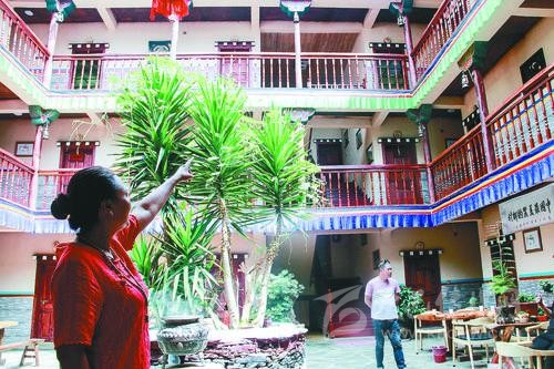 記者在“安卡兒民族莊園”看到,每天游客絡繹不絕,游客們不肯錯過的是這里的鄉(xiāng)愁。眼前的“安卡兒民族莊園”是一座藏式三層小樓,以嘉絨民居為主格調(diào)。從外觀看,這棟三層小樓與村里其他農(nóng)家小院沒有多少差異,但仔細端詳,其所有窗戶大小、高低不一,透出與眾不同的設計風格。走進院內(nèi),這座藏式小樓的走廊外側(cè)裝著木欄桿,欄桿下面掛著藍綠相間的布條,以及大院中央郁郁蒼蒼的盆景,讓人美不勝收。
