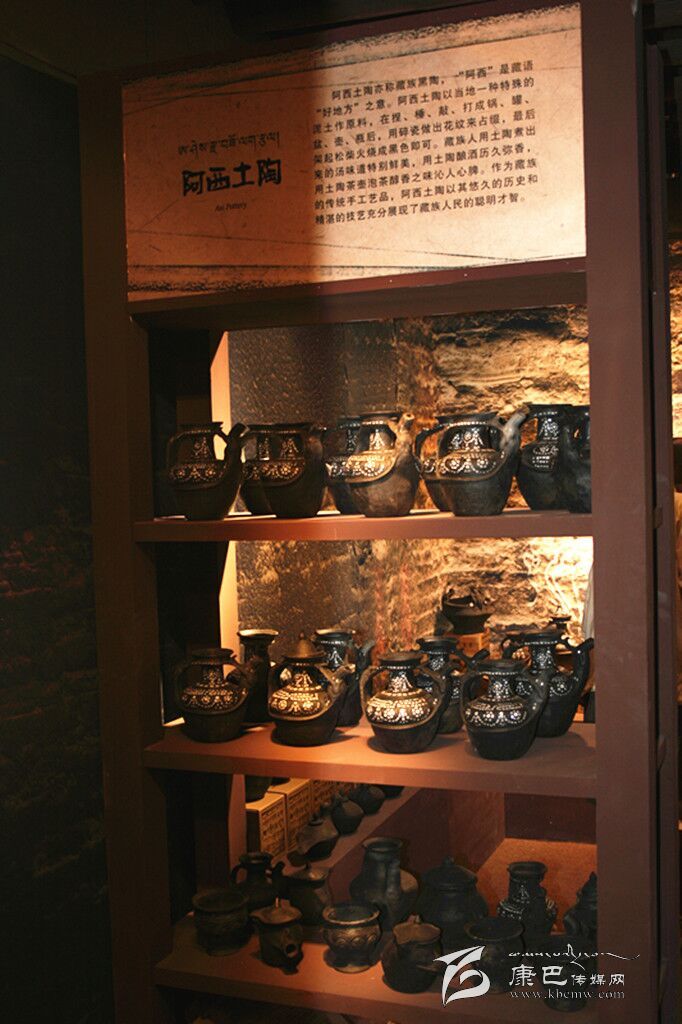 阿西土陶是藏家傳統土法制作的手工藝品,又稱藏族黑陶,因其燒制后呈黑色而得名。阿西土陶以當地一種特殊的泥土為原料,加上其他兩種泥土混合而成,制作中不斷地捏、錘、敲、打,使之成型,還要用碎瓷做出花紋來點綴,最后架起松柴點火燒,在燒紅的土陶上灑上麥糠就呈現出黑色了。阿西土陶主要表現為陶鍋、陶罐、陶盆、陶壺、陶瓶等形式。最初,當地人以陶鍋等換取其它地方的糧食或其它物品,現今的阿西土陶則已經走向市場,更多地作為旅游商品和本地人的家庭裝飾品。