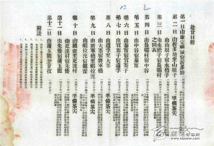 為了安排好戴院長一行的行程,西康建省委員會專門發(fā)出了一份“訓令”。這份時間表就是根據“訓令”要求為戴院長行程作出的安排。每天從何地到達何地,里程多少,休息地有無村莊、寺廟,接待力量如何、是進房屋休息還是支帳篷都有說明,而且對沿途各縣各地提出了包括應準備柴草、應在哪些地方準備“打尖茶”(午飯)等具體要求。