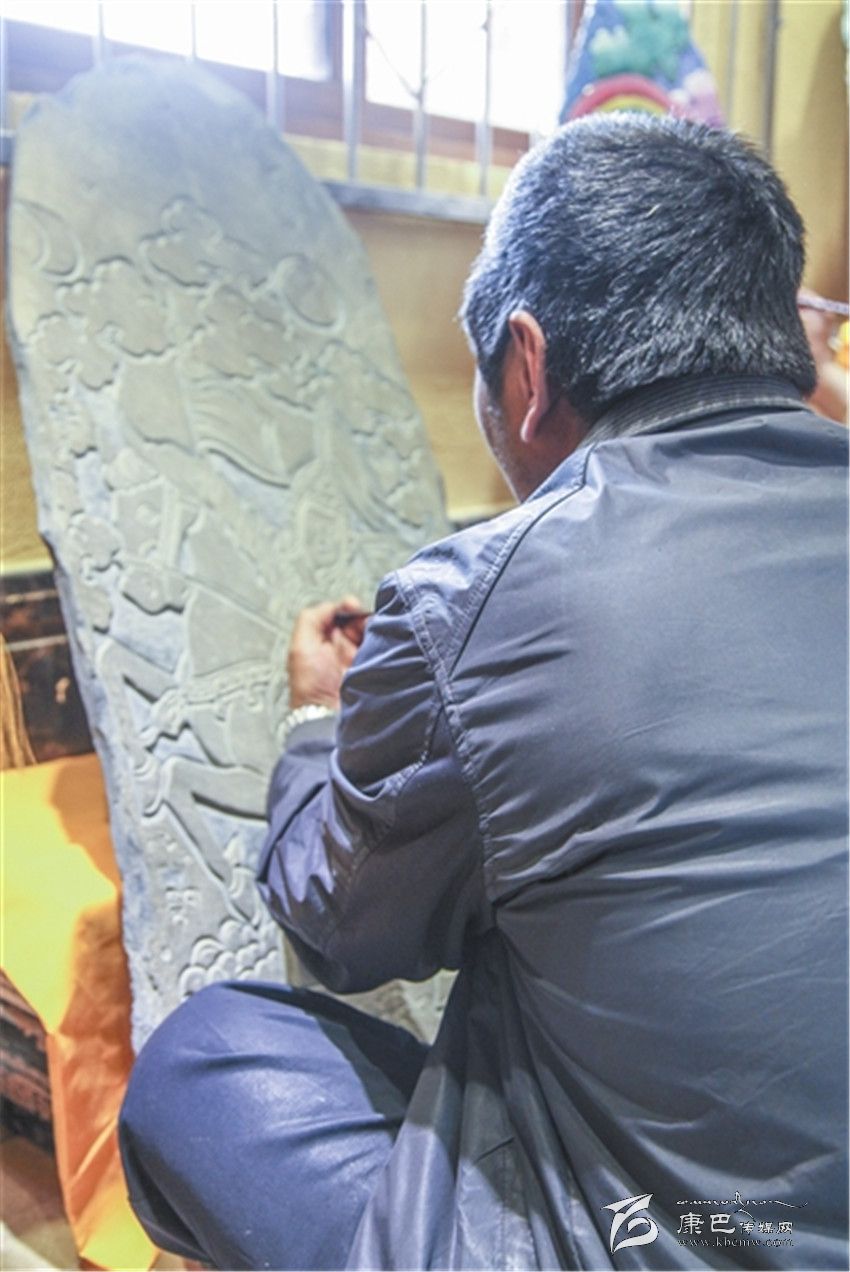 所彭告訴記者,剛開始學習石刻技藝時,就是刻一些“六字真言”之類的作品。經(jīng)歷了五、六年的磨礪后,就開始在土登老人的指點下,刻一些簡單的佛像作品。土登老人辭世后,所彭便擔負起傳承老人技藝的重任。從參軍再到退伍,直到今天,彩繪石刻仍然是所彭的最愛。他說,雖然自己不是非遺傳承人,但這并不重要。重要的是,他喜歡這門技藝,也樂意為格薩爾彩繪石刻傳承做些力所能及的事情。所彭說,他最遺憾的是自己的孩子中沒有一個人學習石刻技藝。但他堅信,經(jīng)過發(fā)掘和保護,會有越來越多的人行走在格薩爾彩繪石刻的傳承路上。
