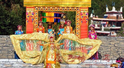 在催人奮進(jìn)的戰(zhàn)鼓聲中,一群身披甲胄的士兵拿著長(zhǎng)劍,背著巨弓走到臺(tái)前,在鏗鏘的戰(zhàn)鼓聲中,戰(zhàn)士們做著各種競(jìng)技動(dòng)作,模仿武士們互相攻擊的樣子,那矯健的身影展示了遠(yuǎn)古時(shí)代嘉絨藏族先民們?yōu)榱松媾c自然努力抗?fàn)幍膱?chǎng)景。過了一會(huì)兒音樂一轉(zhuǎn),戰(zhàn)鼓聲漸漸減弱,在鳥雀的陣陣啾啾聲中,一座木門慢慢的開啟,一位身披長(zhǎng)袍、頭戴鳳冠的女王在眾多美女的簇?fù)硐拢従徸呦屡_(tái)階步入舞臺(tái)中央,此時(shí),一位手捧托盤的老者來到女王面前單膝下跪,將托盤高舉過頂,并邀請(qǐng)女王品嘗佳肴,女王將中指在酒中蘸了蘸,并曲起中指向四周輕輕彈去,寓意愿將杯中美酒與四方百姓同飲。在女王面前還放置著一個(gè)凈水桶,桶中盛滿了清澈的甘泉,桶上橫放著一枝柏樹枝,女王伸出纖纖玉手,拿著柏樹枝在水中蘸了蘸,面向墨爾多神山撒去,寓意向神山祈福。這是此次《美人谷·丹巴》節(jié)目展演中的序曲部分,有著強(qiáng)烈的東女神韻,將遠(yuǎn)古時(shí)代東女國(guó)女王遺風(fēng)展演的淋漓盡致。
