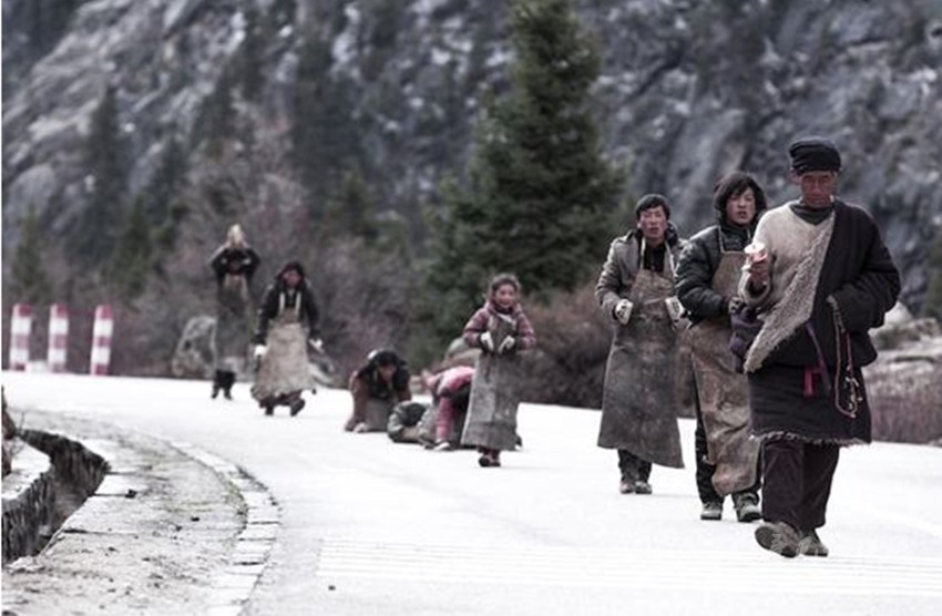 安靜的,用心走入影片,與親人一樣可敬可愛的藏人們圍爐席地而座,一碗接著一碗享用酥油茶和糌粑,細(xì)碎地說些家常的話。探索他們的內(nèi)心世界,選擇與他們一起虔誠朝圣。信仰,使他們變得更加善良、自律,并有著比一般人更強(qiáng)大的信念和毅力。年邁的爺爺為了自己年輕時(shí)的夢想踏上朝圣之路;小女孩對(duì)前路充滿好奇而無所畏懼;孕婦期許美好未來,更加執(zhí)著;屠夫放下屠刀,義無反顧的朝著圣地邁進(jìn)。在那處漫水的路面,我畏懼了,他們卻毫不猶豫地脫掉外套撲向水里,動(dòng)作敏捷,無所顧忌,一秉虔誠的心讓人震撼。影片結(jié)束,我?guī)锥嚷錅I……