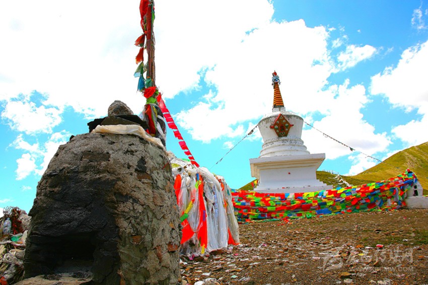 藏族幾乎全民信仰藏傳佛教。折多山上下四周,山頂河谷到處飄揚(yáng)著五色經(jīng)幡,或者印以文字,或者繪以圖案。經(jīng)幡五色,依次是藍(lán)、白、紅、綠、黃,藍(lán)色象征藍(lán)天,白色象征白云,紅色象征火焰,綠色象征綠水,黃色象征大地。五種顏色代表生命賴以存在的基礎(chǔ)。世代生活在高原上的人們對(duì)大自然的變化尤其敏感,故企盼大自然風(fēng)調(diào)雨順,人間太平幸福。佛教慰藉了他們的靈魂,經(jīng)幡寄托了他們的希望。