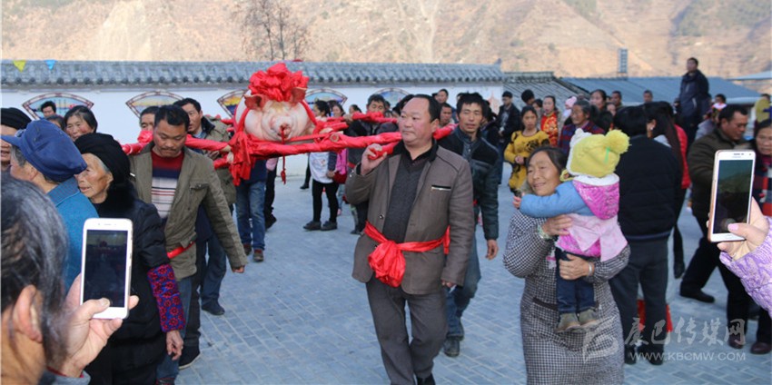 5個(gè)村民將年豬抬到秤上。360斤。村民為年豬準(zhǔn)備大紅花。準(zhǔn)備紙錢、香蠟。9點(diǎn)整,殺豬匠開始了他的工作,在眾人齊心協(xié)力下,光溜溜的年豬被打整干凈。“保佑我們村來年風(fēng)調(diào)雨順、五谷豐登,村民平安健康。”村中老者敬過天地后,8個(gè)身強(qiáng)力壯的村民站在年豬旁,豎著拇指齊聲說,今年家家戶戶還要養(yǎng)大肥豬。抬著年豬,村里的中老年人簇?fù)碇?,走在最前面,唱著悅耳的民謠,大意是歌唱幸福生活的,迎著2018年的第一縷陽光,村民們喜氣洋洋。到村里來的游客蜂擁拍照。