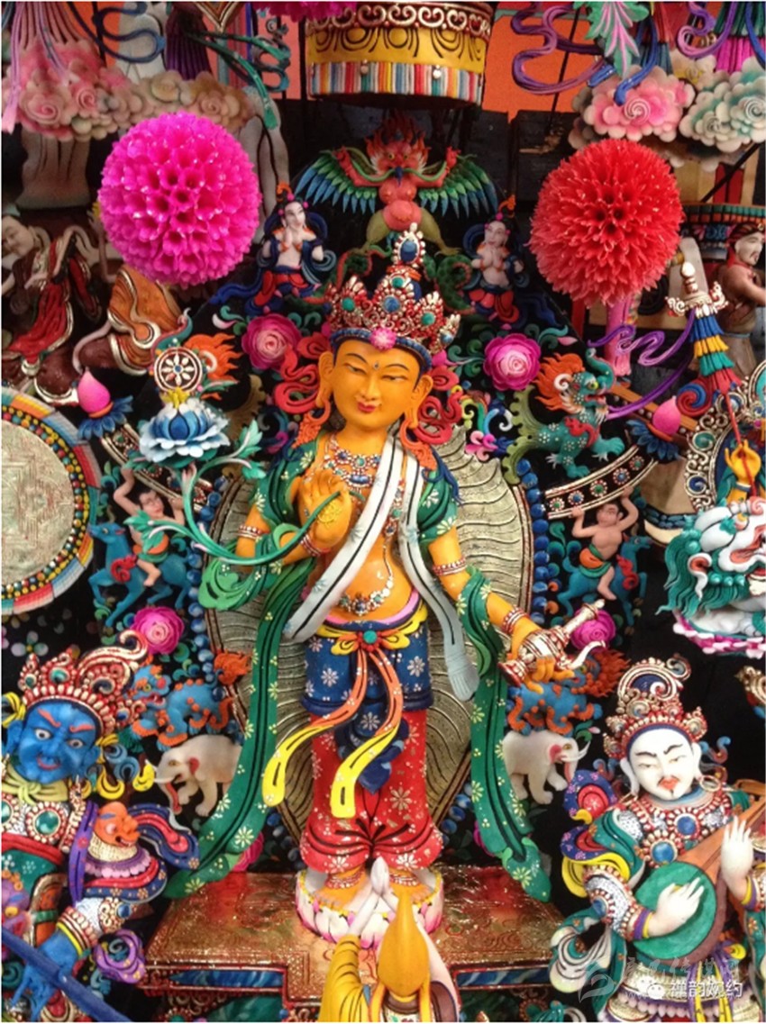 有傳說稱641年文成公主進藏,帶去一尊釋迦牟尼12歲等身像并將其供奉于拉薩的大昭寺,當(dāng)?shù)厝罕娪盟钟妥龀苫ü┇I于佛前,以示崇敬之心,后各藏傳佛教寺院相繼使用,視為禮佛珍品,獻酥油花遂成為正月祈愿大法會的重要內(nèi)容。在發(fā)展過程中,酥油花的塑造方式、花色品種、內(nèi)容題材和工藝技巧都不斷發(fā)生著變化。
