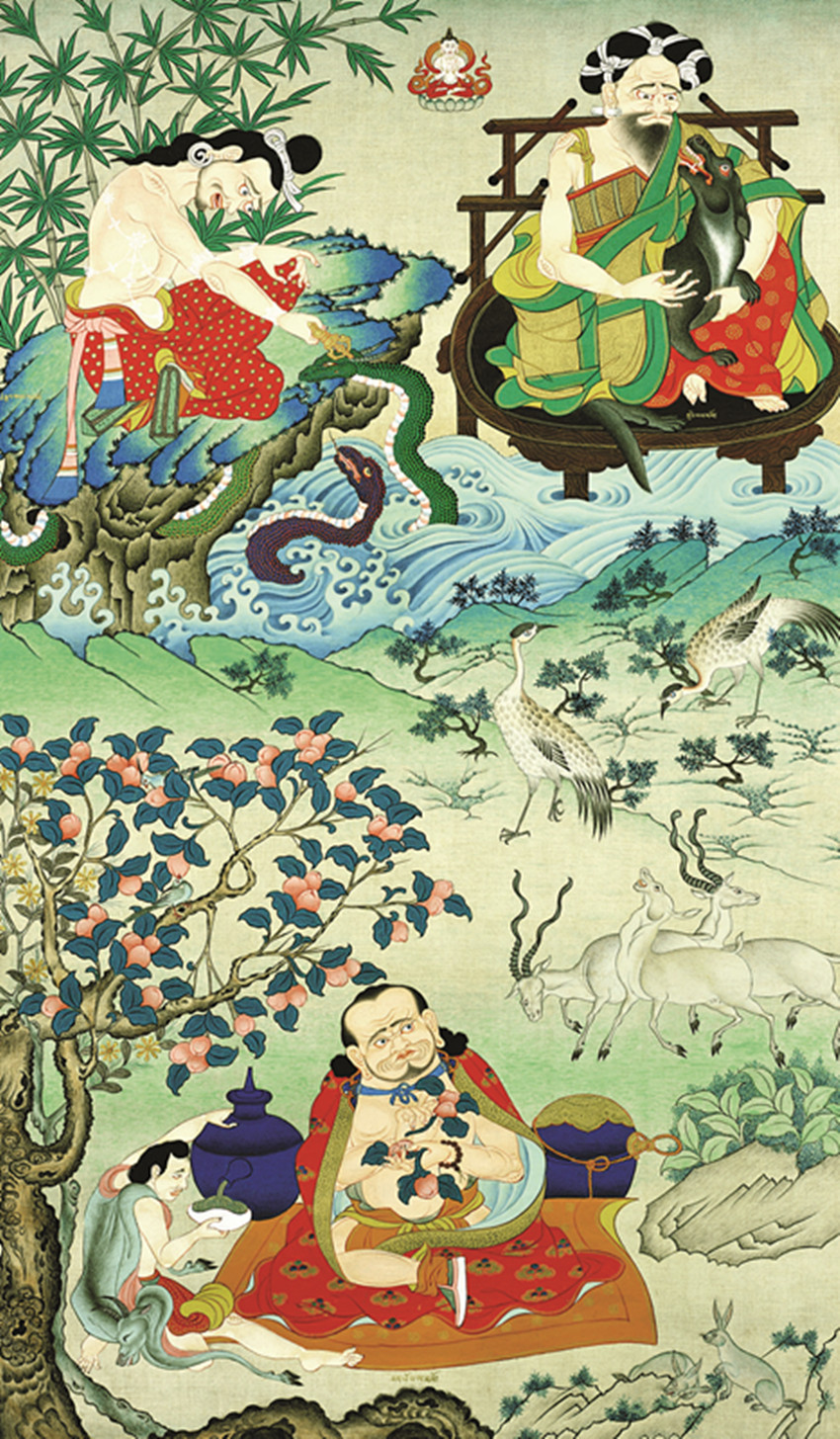 欽孜派的開(kāi)山鼻祖是貢嘎崗堆·欽則欽莫。從技法上講,勉唐、欽孜兩派的技法都是繼承尼泊爾繪畫(huà)“重彩平涂”的畫(huà)法,欽孜畫(huà)派還擅長(zhǎng)對(duì)同類(lèi)色的豐富調(diào)配,以及在石色之上用透明色暈染的技法使用。從風(fēng)格上看:兩派有著相同的藝術(shù)追求,但欽則畫(huà)派是在保守的創(chuàng)新,雖然它也吸收漢地藝術(shù)畫(huà)了很多山水,但它的山水元素只是為了填補(bǔ)畫(huà)面,沒(méi)把背景山水從作為一幅畫(huà)來(lái)考量;它的畫(huà)面常用直線形來(lái)分隔風(fēng)景,近似像平涂色塊的版畫(huà)。(未完待續(xù))