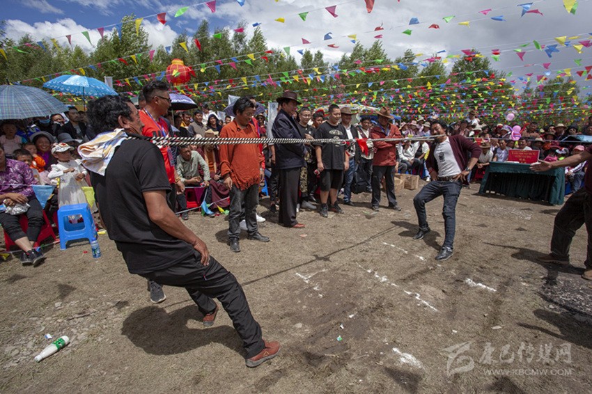 除以上活動(dòng),滾桶接力、俯撐馬鞍吃葡萄、穿藏裝揉糌粑、套牛角等趣味比賽無不展示民族體育的獨(dú)特風(fēng)格?!斑@種拔河還是第一次見,很有意思?!逼渲?,“格吞”比賽(把帶子套在脖子上拔河)深得觀眾喜愛。