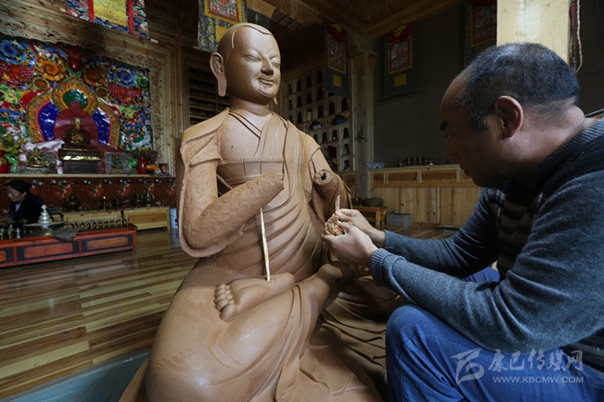 見到克村時,他正在鄰村一農戶的經堂里制作佛像,盤坐在蓮花寶座上的宗喀巴大師和兩個弟子身披袈裟手持經書的泥塑作品神形兼?zhèn)?,這是克村和徒弟多登近半個月的心血??舜遄诓級|上,心無旁騖神情專注地,用木制工具對作品進行打磨,旁邊擺放著一盆清水和一筐自制的工具。