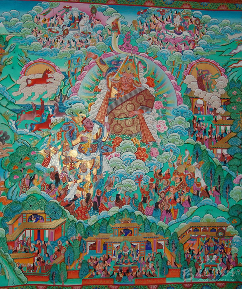 解放前的舊西藏以及其他藏區(qū),基本上處于封建農(nóng)奴制社會和部落社會,實行政教合一的政治制度。過去藏族基本上是一個全民信教的民族,佛教文化和苯教文化在意識形態(tài)和文化領(lǐng)域占據(jù)統(tǒng)治地位,“德唐”、“協(xié)唐”和“杰唐”也成為唐卡藝術(shù)的主要內(nèi)容。因此,反映宗教觀念、表現(xiàn)宗教題材的唐卡,得到上層統(tǒng)治階級和信教群眾的關(guān)心、重視和扶持,發(fā)展迅速,數(shù)量眾多、藝術(shù)精湛,達(dá)到美侖美奐的程度。為了更深入、更全面地將宗教教義、宗教儀軌、宗教觀念、宗教信仰深入到信教群眾中去,最基本、也是最有效的方式,就是將宗教觀念、宗教信仰藝術(shù)化、形象化,讓藝術(shù)形象凝聚為宗教文化,讓唐卡藝術(shù)生動地、形象地、以通俗易懂的方式講述歷史故事,傳播宗教教義。一些重要的唐卡繪制完畢,還會舉行隆重的開光儀式和祈禱法會,以增強(qiáng)它的神圣性和神秘感。各寺院懸掛的、珍藏的幾乎全是這類唐卡。在過去,豪門貴族、土司頭人,乃至普通人家,也都有懸掛和珍藏唐卡的習(xí)俗。一座寺院收藏幾千幅、乃至上萬幅唐卡,是很平常的。