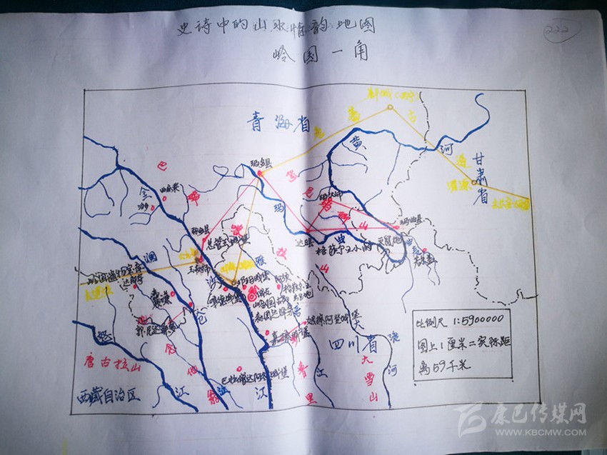 幾十個春秋里,劉安全所做的遠不止這些。他還自制了平面地圖、格薩爾王族譜圖等。根據(jù)實地考察所見,他繪制了43個“嶺”國城堡遺址地形簡圖,記者見到了其中幾幅。圖中,大山、河湖、遺址等清晰可見,不失為了解格薩爾史詩的上好資料。