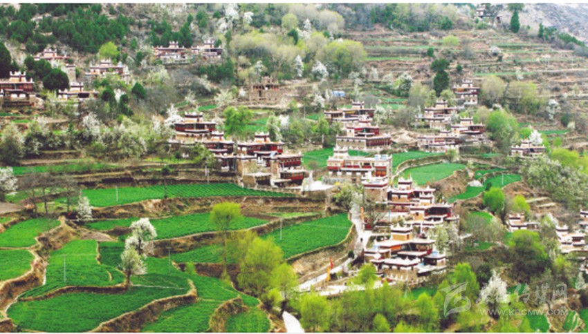 甲居,藏語是“百戶人家”的意思。實際上甲居藏寨分為一村、二村、三村共150余戶人家,700多人口,甲居藏寨所在地形如一個面積為5平方公里的大盆,大盆斜倚卡帕瑪群山,一棟棟外形別致、色彩鮮艷的典型嘉絨藏式民居錯落有致地從山腳一直排到半山。甲居人一代一代修造的梯田點綴民居之間,顯示出別具一格的田園韻味。茂密的柏樹掩映著民居,這些別致的民居不象故宮規(guī)模對稱,也不象蘇州園林隨興布局。碉樓式的民居雖無嚴格的統(tǒng)一規(guī)劃,但卻似乎不是隨意而建,每棟民居都有它獨特搶眼的風格。正是這些別具一格的座座碉樓民居,構(gòu)成甲居藏寨的精妙絕倫。民居外所立的經(jīng)幡以及房頂隨風飄動的瑪尼旗,又為恬靜如詩的鄉(xiāng)土民居增添了無限神秘的色彩。祥云籠罩山頂,溪水潺潺環(huán)流,山腳滾滾河流,山水渾映,天水合一,筆者一行不由驚嘆,甲居藏寨 ,名符其實的人間仙境,世外桃源!先前道路險峻留在心底的驚懼早已一掃而光,一行人激動著迫不及待地撲身于美不勝收的仙境之中。