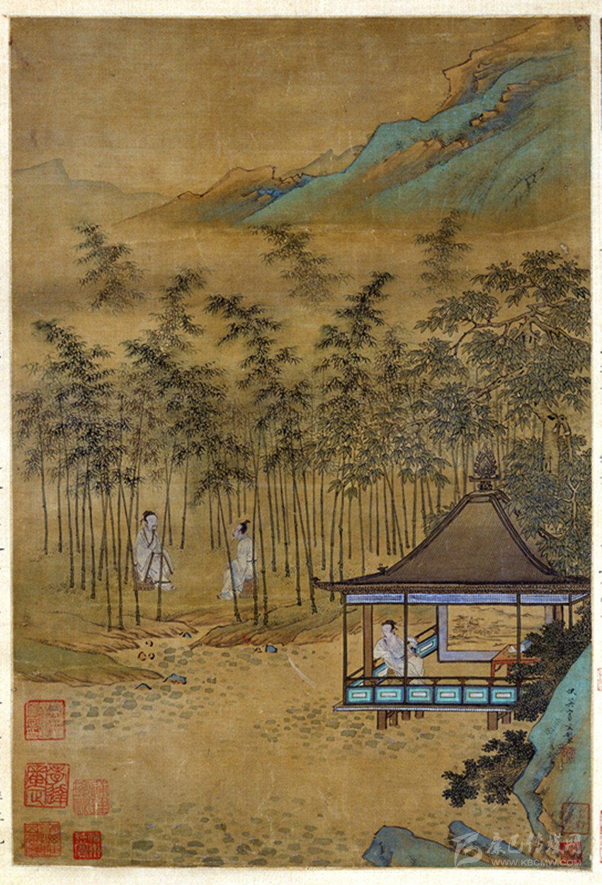 此圖意境極像唐代詩(shī)人王維的藍(lán)田山別墅。這里林木茂密,山澗淙淙,館舍、房屋散布其間,每到夏季,山風(fēng)習(xí)習(xí),涼爽怡人,王維和文友們?cè)诖硕认谋苁?,垂釣飲酒,談?wù)撛?shī)文,修身養(yǎng)性,過(guò)著悠閑自在的隱居生活。他在《竹里館》一詩(shī)里寫(xiě)過(guò)自己的隱居快樂(lè)感受:“獨(dú)坐幽篁里,彈琴?gòu)?fù)長(zhǎng)嘯。深林人不知,明月來(lái)相照。”全詩(shī)格調(diào)幽靜閑遠(yuǎn),仿佛詩(shī)人的心境與自然的景致全部融為一體了。宋朝詩(shī)人楊萬(wàn)里喜歡在皎潔的月光之下,清輝孤影,來(lái)到搖曳的竹林中,聽(tīng)著夏夜里悅耳的蟲(chóng)鳴,夜深氣清,盡管沒(méi)有涼風(fēng)送爽,但是悶熱暑氣頓時(shí)消失,于是他寫(xiě)了一首《夏夜追涼》詩(shī):“夜熱依然午熱同,開(kāi)門小立月明中。竹深樹(shù)密蟲(chóng)鳴處,時(shí)有微涼不是風(fēng)。”