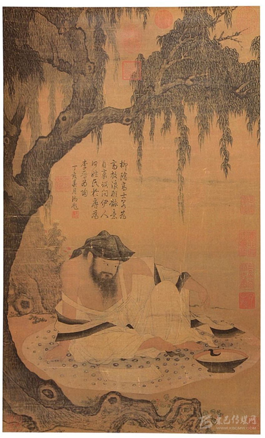 陶淵明曾說(shuō):“夏月虛閑,高臥北窗之下,清風(fēng)颯至,自謂羲皇上人?!币粋€(gè)高人隱士酒后高臥草廬窗下,悠閑自得乘涼的形象躍然紙上。唐代詩(shī)人李白非常向往陶淵明恬淡閑逸、與世無(wú)爭(zhēng)、天人合一的隱逸生活,寫(xiě)詩(shī)曰:“陶令日日醉,不知五柳春。素琴本無(wú)弦,漉酒用葛巾。清風(fēng)北窗下,自謂羲皇人。何時(shí)到栗里,一見(jiàn)平生親。”表達(dá)了對(duì)陶淵明人品和理想的仰慕之情?,F(xiàn)藏于臺(tái)北故宮博物院的宋人《柳蔭高士圖》即是此意境。據(jù)《石渠寶笈》記載,此圖為素絹本著色畫(huà),左方下有孫承澤印,右方下有北平孫氏印,左邊幅有棠村審定、蕉林二印。只知為宋人之作,相關(guān)的背景則無(wú)從查考。畫(huà)中為一棵古柳樹(shù),樹(shù)干虬曲剛勁,枝葉繁茂。樹(shù)下一翁,美髯飄忽,袒胸露腹,頭戴葛巾,赤足席地而坐。坐前有一幅展開(kāi)的手卷,酒樽滿盈,淺斟低酌。表面上看此翁雙目聚神,凝視手卷,實(shí)則已是眼餳耳熱,醺醺然不勝桮杓。清乾隆皇帝對(duì)《柳蔭高士圖》十分喜愛(ài)欣賞,在畫(huà)上御筆題詩(shī)云:“柳蔭高士若為高,放浪形骸意自豪。設(shè)問(wèn)伊人何姓氏,于唐為李晉為陶?!鼻〉壅f(shuō),這位高士如是唐人就是李白,如是晉人便是陶淵明。但是從服飾和環(huán)境看,應(yīng)是五柳先生陶潛也。這幅圖所表現(xiàn)的就是“心靜自然涼”。