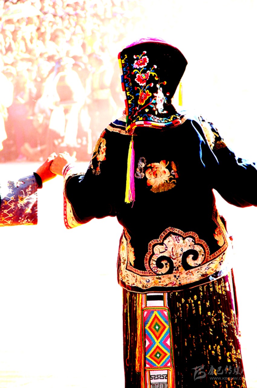 這些服飾雖歷經(jīng)歲月的滄桑,依然被完整的保存下來(lái)。如今,在上下宅龍村寨里,保存完整的有五十余套。每一年,村寨里舉辦活動(dòng)時(shí),村寨里的婦女們從木箱里取出這些服飾,小心翼翼地穿在身上,載歌載舞。在她們舞動(dòng)的時(shí)候,仿佛被這些服飾帶入幾百年前的時(shí)光里,時(shí)空在這一瞬間已完全改變。這時(shí)候,服飾上艷麗的圖案將舞者們襯托得更加美麗動(dòng)人,無(wú)怪乎《章谷屯志略》中有“逢慶典時(shí)著蟒衣文繡亦頗美觀”這樣的記載。