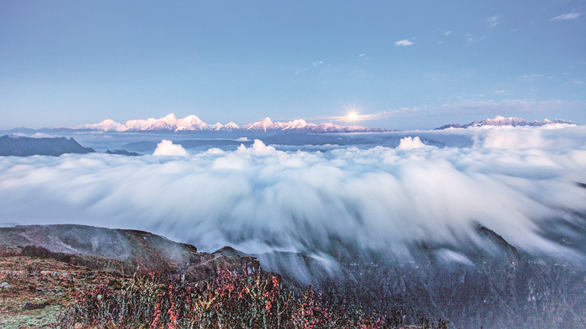 這是天上貢嘎寬大為懷、兼容并包的不凡氣度。它以獨具魅力和氣吞山河的雄偉壯麗,以及無法憾動的王者之軀,包容并呵護(hù)著無數(shù)群峰、千溝萬壑、萬物生靈和諧共生共處,展現(xiàn)出一幕幕眾山拱衛(wèi)下精致的山岳大戲。如此這般,既把自身推向了高點,又使依偎在身邊甚至遠(yuǎn)處的萬物生靈各得其所、各展其長、各有所獲。