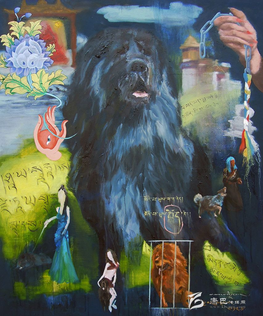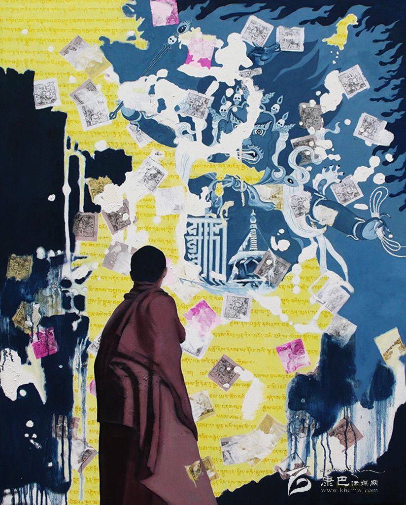 采用藏區(qū)題材做藝術(shù)的藝術(shù)家不在少數(shù),強調(diào)寫實、原汁原味是大部分藝術(shù)家的選擇,但生于康定的藝術(shù)家周韜卻有另一番更深入的認(rèn)識。與美國印第安藝術(shù)家Brad kahlhamer一樣,他用更加強烈動態(tài)的視覺制造了一個魔幻世界,讓眾人熟悉的藏區(qū)元素在畫面上集中而豐富地跳躍起來,比如喇嘛、活佛、長辮子的藏族女人,甚至形狀怪異的骷髏!