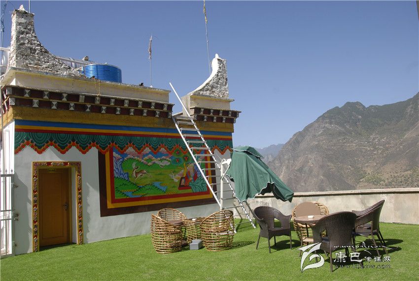 客棧的設計完全是藏式風格,很吻合楊荻給客棧起的名字:圣地映像。從大廳開始一直到客房,金碧輝煌、雕梁畫棟,每一處空間都被藏地色彩充滿。樓頂,視野開闊,左手青山,右手青天。幾個內(nèi)江來的客人已在客棧呆了好幾天,他們正在燦爛陽光下商量爬山的事,他們一再和楊荻碰面,希望晚上回到客棧能吃上本地的土雞。