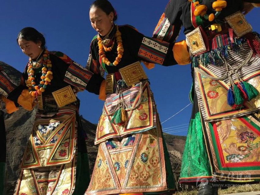蒙自鍋莊服飾獨特,屬東義服飾類。稻城東義女式服飾感覺與鄉(xiāng)城瘋裝有些相似,融合了納西族女裝和稻城土裝的元素,一是折疊多、折疊數(shù)是固定的,內(nèi)折和外折各54個,左右胸襟分別以紅黃綠黑等顏色的料子鑲拼而成,分別代表財富、福壽、牲畜、先知、土地。男式服裝比較簡便,突出之處就是系在腰間的彩帶。