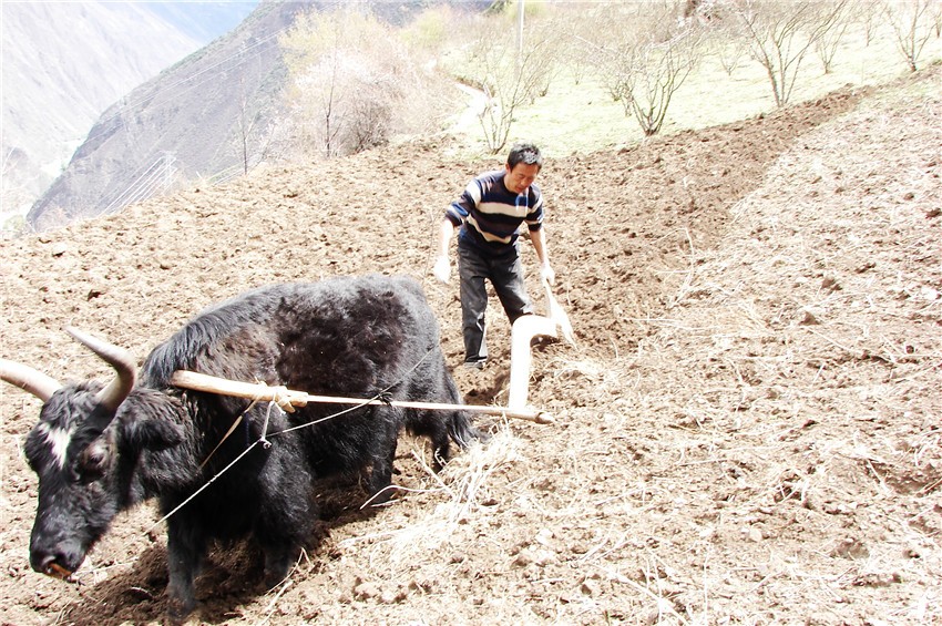 在春播這天,男女老少都穿上節(jié)日的盛裝。給每一頭耕牛的角抹上了油,在陽光的照耀下發(fā)出逼人的寒光,牛的頸上,系著一根雪白的哈達(dá),犁鏵也被擦拭得锃光瓦亮的,“架單”(用紅樺做成,成彎曲狀)架在牛的頸上,牛肋兩邊,兩條粗如兒臂的繩索連接著“架單”和犁頭,耕地的男人們將犁鏵插進(jìn)地里,等待儀式的開始。