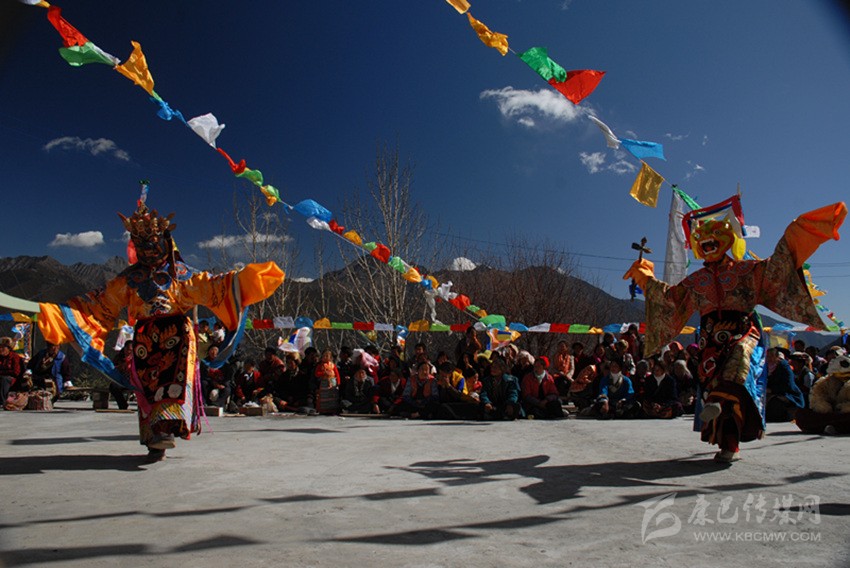 康巴藏傳佛教各派每年冬春都要舉行面具不同、內(nèi)容各異的跳神祭祀活動,規(guī)模最大的數(shù)德格縣更慶寺的普巴多吉——《金剛撅童子》跳神。這一活動于藏歷每年元月中旬舉行,由僧人演出,連續(xù)兩天,是歷時十天的佛事活動的組成部分。屆時群眾從四面八方絡(luò)繹而至,上萬人匯聚于大壩爭相觀看,場面十分壯觀。