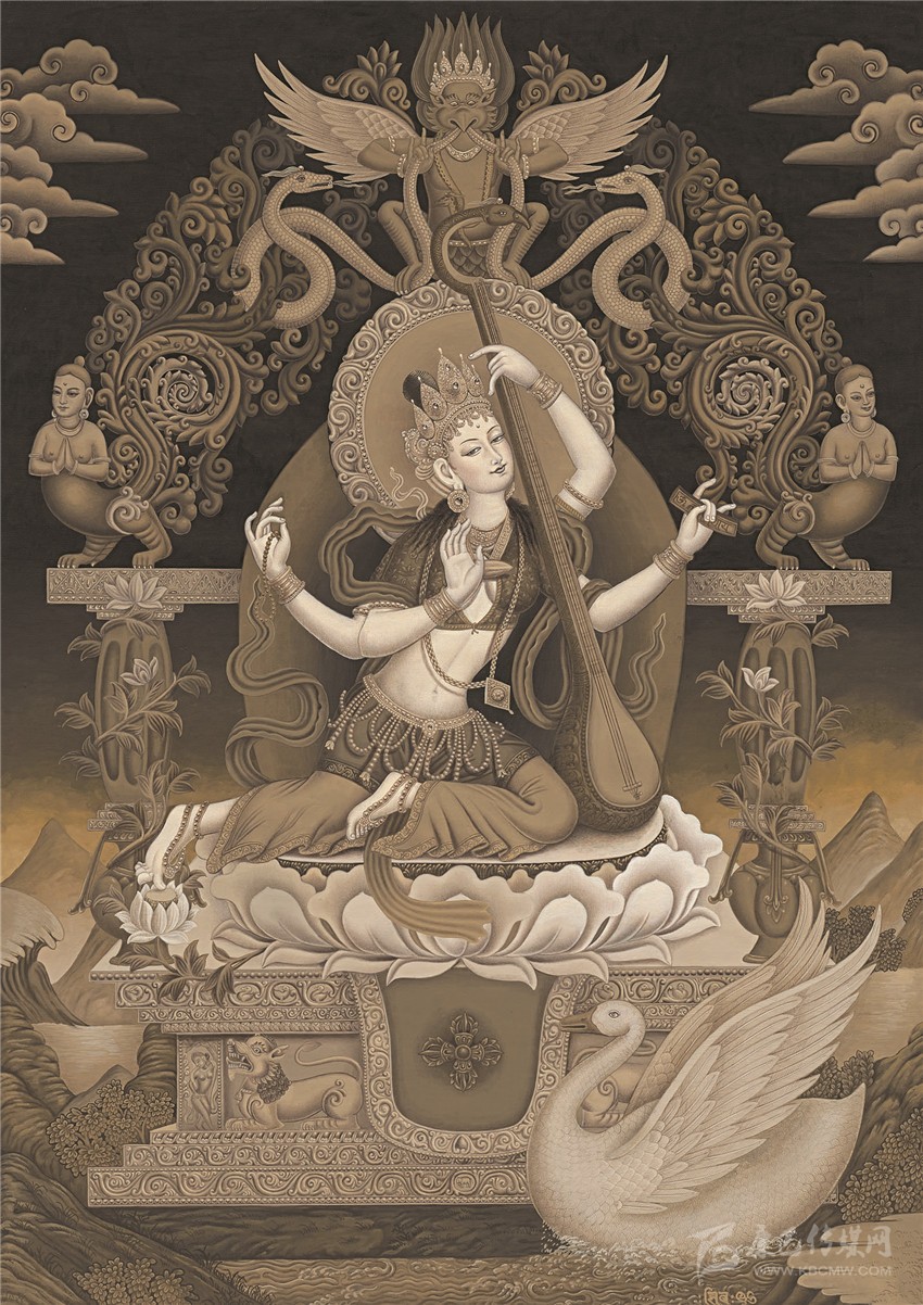 (一)對比色調(diào):畫面顏色干凈,對比強(qiáng)烈,大多用對比色來彰顯力量;施金華麗、燦爛而不泛濫。(二)暗色調(diào):畫面明度較低,常用黑色、藏青、絳紅、深綠來調(diào)劑各類原色,使得畫面色彩沉郁中透露出清新、凝重中綻放出優(yōu)雅,色彩的過渡細(xì)膩而豐富。(三)素色調(diào):尼瓦爾唐卡最有特色的就是“素色調(diào)”的唐卡(簡稱“素唐”)。筆者之所以稱其為“素色調(diào)”而不稱作“黑白”或“單色”,是因為畫面雖然沒有明顯的色彩,但是也非單一的黑色或灰色。它不僅調(diào)配了從深到淺的許多色階;還有雅致的黃灰、曠遠(yuǎn)的藍(lán)灰、宏大的紅灰等諸般色相的交響以及微妙的冷暖搭配,整體呈現(xiàn)出夢幻般的美感。