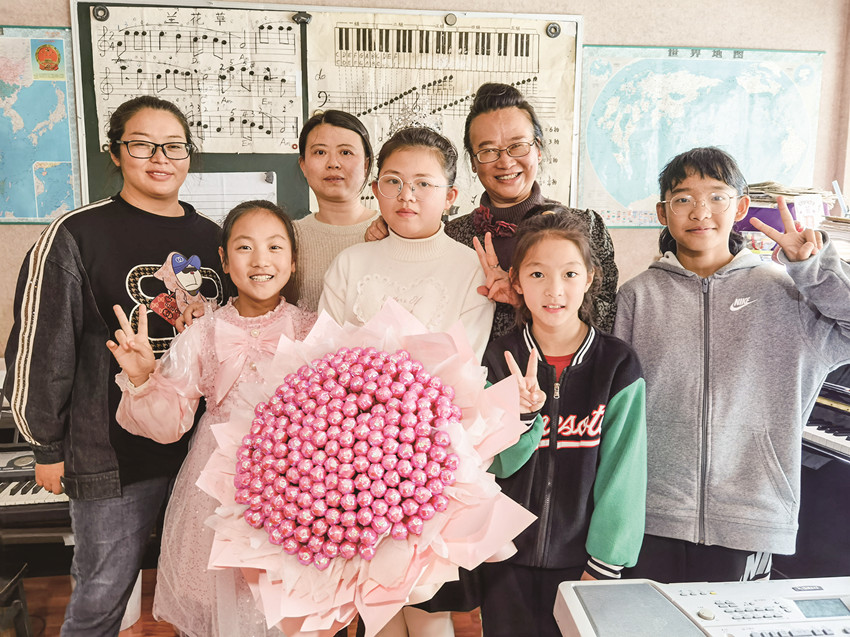 獲得榮譽后,肖欣蕊和老師、同學(xué)分享快樂。 受訪者 供圖