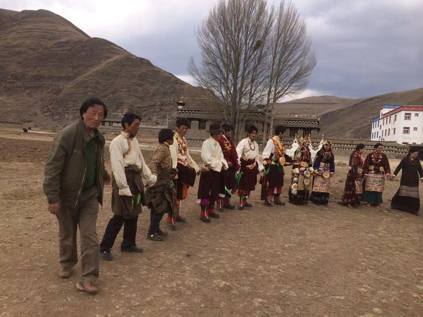 盡管,秋加措不喜歡跳舞,但藝術(shù)的種子卻貌似很早便深埋于他的血液里了。秋加措出生在德格鄉(xiāng)下國道317線邊上一個(gè)叫龔埡的小村莊,全村約四十戶人家。盡管村莊很小,但村里卻有著濃厚的藝術(shù)氛圍。當(dāng)時(shí)農(nóng)村土地公有,實(shí)行合作社制,出工都是集休行動(dòng),因此,在中間休息時(shí),能歌善舞者就會(huì)舞蹈或唱歌。而每逢節(jié)日,人們匯集于曬場,曬場中間燃起篝火,男女各自分邊組隊(duì),跳起本地特有的鍋莊舞,常常一跳就是數(shù)日。通常跳鍋莊舞都有領(lǐng)舞,由當(dāng)?shù)啬芨枭莆枵邠?dān)任,秋加措的母親是他們村領(lǐng)舞者之一。每當(dāng)夜晚大人們?nèi)计痼艋?,跳起鍋莊時(shí),秋加措便和小伙伴們圍坐在火塘邊看大人們舞蹈。也許在潛移默化中,音樂對秋加措產(chǎn)生了深刻的影響,不知不覺中對藝術(shù)親近了。