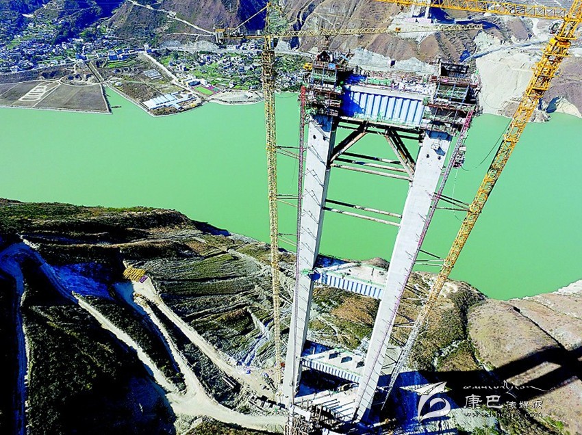大渡河特大橋全長1411米,主橋是單跨1100米鋼桁梁懸索橋,抗震設(shè)計(jì)烈度9級(jí),主塔橫梁采用波形鋼腹板,這是全國首個(gè)將波形鋼腹板應(yīng)用于高速公路橋梁索塔橫梁的工程。橋址區(qū)位于3個(gè)地震斷裂帶交匯處,處于大渡河干熱河谷,氣象條件多變,瞬時(shí)風(fēng)速最高可達(dá)每秒32.6米,相當(dāng)于12級(jí)臺(tái)風(fēng),施工難度大。為便于施工,施工方從318國道旁借道,建起3.5公里的便道,可從山頂?shù)竭_(dá)墩底建設(shè)點(diǎn)。受地形限制,便道呈“之”字形折返往上,成為一道獨(dú)特的景致。僅修建這條便道就挖了近12萬立方米土,若壘起來,相當(dāng)于一個(gè)長100米、寬100米、高12米的巨型建筑。