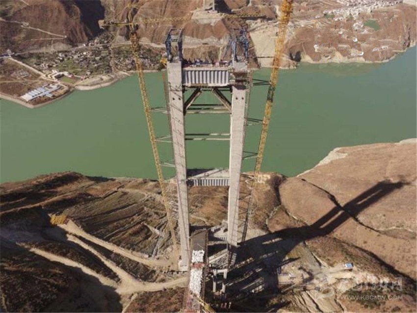 沿國道318線繼續(xù)往康定方向走,奔涌的大渡河鑲嵌在連綿起伏的山巒之間。車行一段距離后,矗立在河兩岸的兩座高聳的橋塔映入眼簾。這就是建設中的“川藏第一橋”——瀘定大渡河興康特大橋。