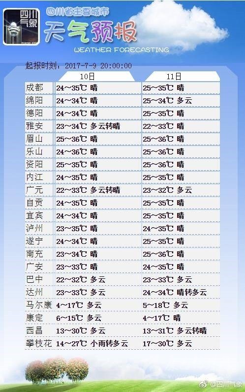 11日晚上到12日白天:盆地各市多云,廣元、巴中、雅安3市及綿陽、德陽、成都、眉山、樂山5市西部有陣雨或雷雨;川西高原和攀西地區(qū)晴轉(zhuǎn)多云,大部分地方有陣雨或雷雨。