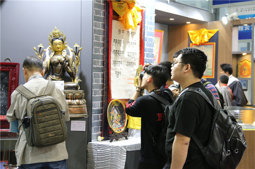 本網(wǎng)訊(記者 宋志勇 文/圖)“這是由什么材料鑄成的物件?”“這件作品的寓意是什么?”“這是一件花色青銅《綠度母佛像》,分別由金、銀、銅鑄成,高100cm、寬50cm,綠度母為觀世音菩薩的化身?!?月12日是第十四屆中國(guó)(深圳)國(guó)際文化產(chǎn)業(yè)博覽交易會(huì)第三天,甘孜展館迎來(lái)了眾多參觀者,在館內(nèi)市民正與白玉縣董察文化發(fā)展有限責(zé)任公司董事長(zhǎng)日多一問(wèn)一答。
