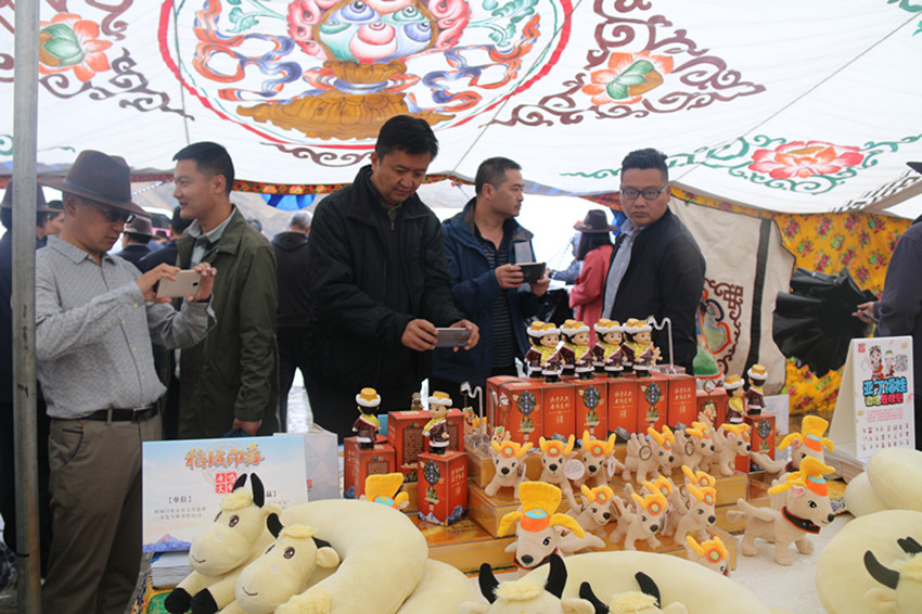 色拉鄉(xiāng)村旅游綜合體內(nèi)展示的稻城文創(chuàng)產(chǎn)品引來眾多參會者圍觀。