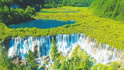 重建實(shí)踐彰顯生態(tài)理念——九寨溝景區(qū)內(nèi),尊重自然、綠色修復(fù)的舉措不勝枚舉。地震后,諾日朗瀑布出現(xiàn)一條16.8米長(zhǎng)的裂縫,僅剩一股急流。景區(qū)就地取材,用地震中垮塌的鈣化物來(lái)填補(bǔ)“漏水”的裂縫,豐水期時(shí),諾日朗瀑布恢復(fù)了昔日壯觀(guān)景象。