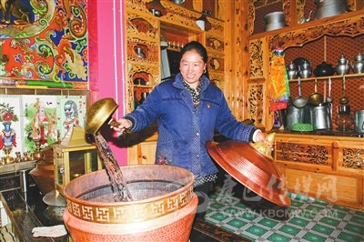 寬敞的院壩,卵石鋪就的花臺花開爭艷,獨(dú)立的衛(wèi)生間和廚房里,現(xiàn)代廚衛(wèi)一樣不缺,三個(gè)冰柜擺滿了食品,燒烤爐擺在廚房一角。走進(jìn)頂真的客廳,55吋的液晶電視,造型典雅別致的碗柜,琳瑯滿目的各式器皿,藏桌上擺滿了水果和飲料。坐在“豪華”的客廳里,頂真幸福開懷。
