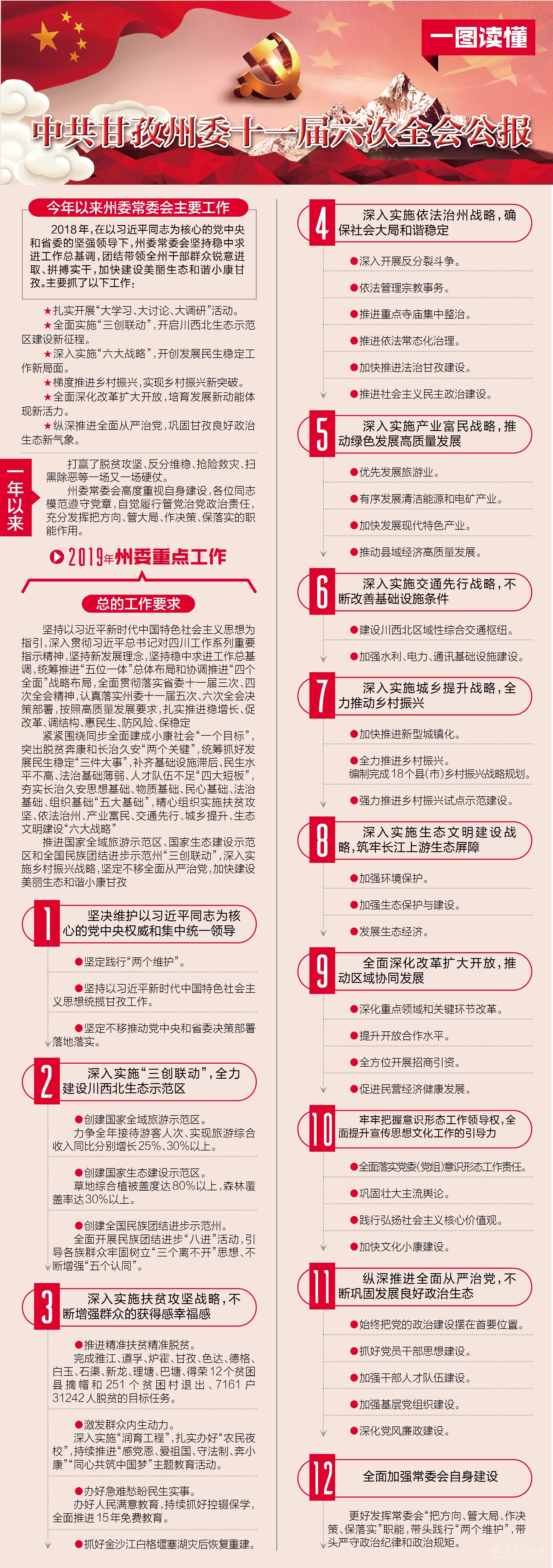 2018年,在以習(xí)近平同志為核心的黨中央和省委的堅(jiān)強(qiáng)領(lǐng)導(dǎo)下,州委常委會(huì)堅(jiān)持穩(wěn)中求進(jìn)工作總基調(diào),團(tuán)結(jié)帶領(lǐng)全州干部群眾銳意進(jìn)取、拼搏實(shí)干,加快建設(shè)美麗生態(tài)和諧小康甘孜。主要抓了以下工作:
