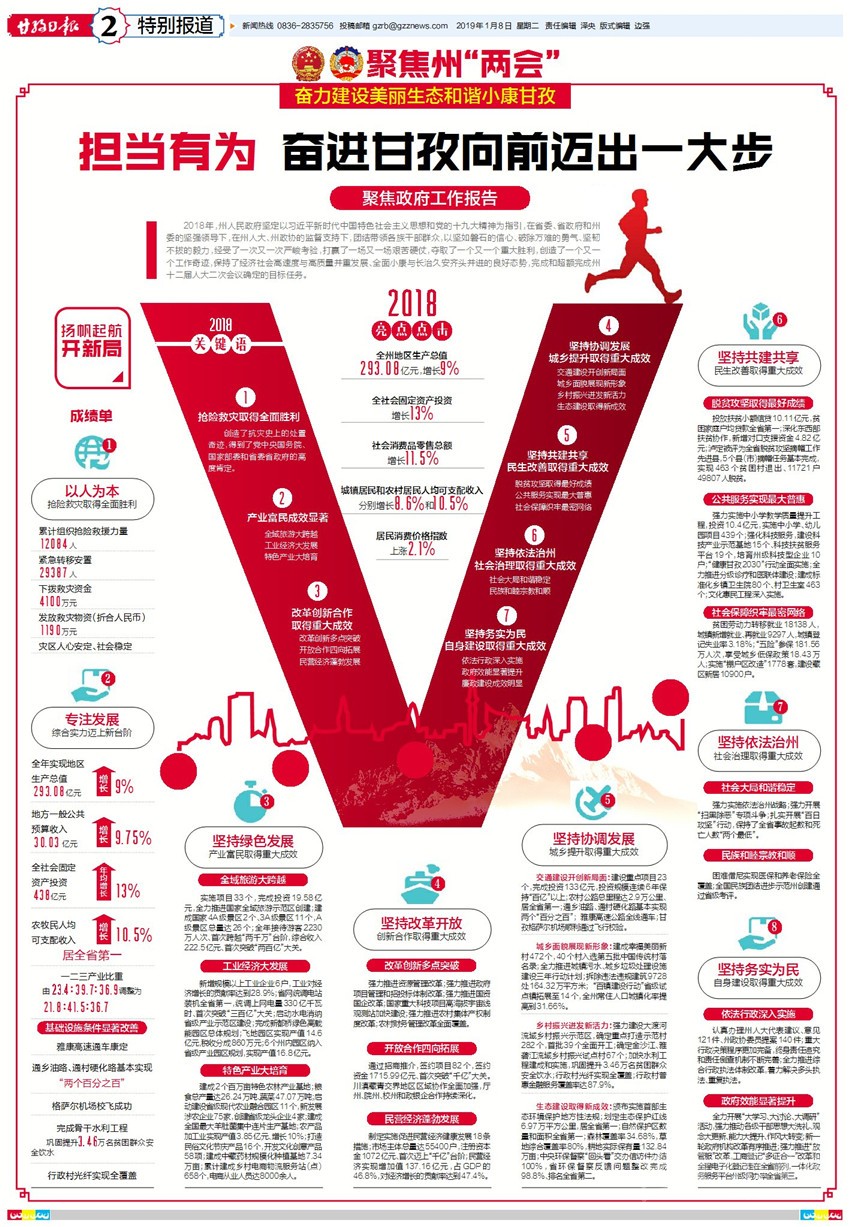 2018年全州實現(xiàn)地區(qū)生產(chǎn)總值293.08億元,增長9%,超目標任務1.5個百分點;地方一般公共預算收入30.03億元,增長9.75%,超目標任務1.75個百分點”“城鎮(zhèn)居民人均可支配收入32022元,增長8.6%,超目標任務0.1個百分點;農(nóng)村居民人均可支配收入11540元,增長10.5%,超目標任務0.5個百分點……