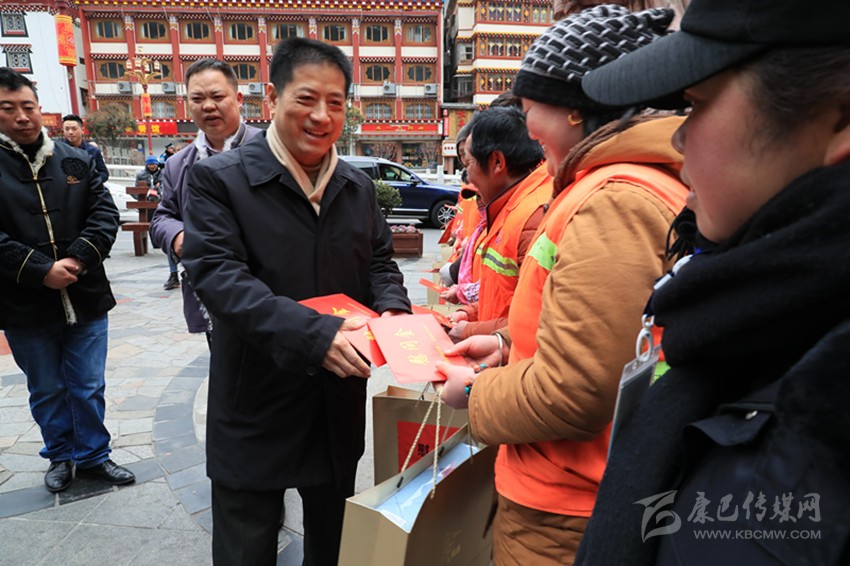 “你們每月工資多少?都按時(shí)領(lǐng)到了嗎?還有什么困難嗎?……”,慰問(wèn)中劉成鳴非常關(guān)心環(huán)衛(wèi)工人的生產(chǎn)生活情況,與大家一一握手問(wèn)好。劉成鳴代表州“四套班子”向奮戰(zhàn)在環(huán)衛(wèi)戰(zhàn)線的全體干部職工致以崇高敬意和新春?jiǎn)柡?,?duì)堅(jiān)守崗位的環(huán)衛(wèi)工人付出的辛勤勞動(dòng)表示衷心感謝。他說(shuō),環(huán)衛(wèi)工人是城市的“美容師”,情歌之城康定近年來(lái)城市面貌不斷提升、城市環(huán)境不斷改善,這是我們環(huán)衛(wèi)工人辛勤勞動(dòng)和無(wú)私奉獻(xiàn)的結(jié)果。他說(shuō),隨著雅康高速的貫通,越來(lái)越多的游客會(huì)走進(jìn)甘孜來(lái)到康定,希望大家在新的一年里,再接再厲,繼續(xù)發(fā)揚(yáng)無(wú)私奉獻(xiàn)精神,立足本職,愛(ài)崗敬業(yè),把康定打扮得更加靚麗,為城市形象提升和全域旅游發(fā)展做出更大貢獻(xiàn)。他要求,相關(guān)部門(mén)要進(jìn)一步關(guān)心關(guān)愛(ài)環(huán)衛(wèi)工人,解決好他們工作和生活中的實(shí)際困難。
