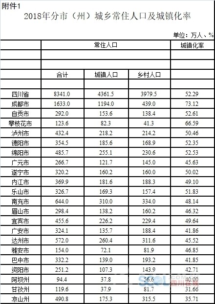 3月19日上午,四川省人民政府新聞辦公室召開新聞發(fā)布會,發(fā)布2018年四川省人口統(tǒng)計(jì)公報(bào)。四川新聞網(wǎng)記者從會上獲悉,四川省公安廳提供的數(shù)據(jù)顯示,2018年末全省戶籍人口9121.8萬人,其中城鎮(zhèn)人口3271.5萬人,鄉(xiāng)村人口5850.3萬人,戶籍人口城鎮(zhèn)化率35.87%。