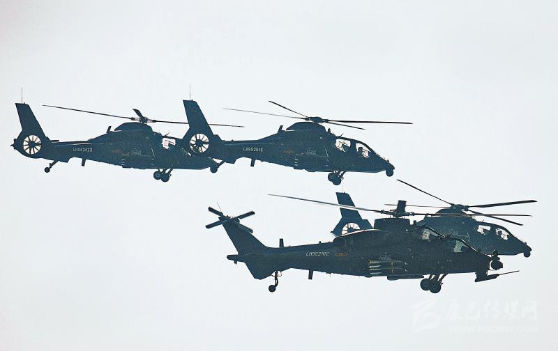 陸航突擊梯隊(duì)共分5個(gè)模塊,受閱機(jī)40架。第一模塊為偵察警戒模塊,由5架直-9直升機(jī)組成5機(jī)楔形隊(duì)形;第二模塊為火力突擊模塊,由9架直-10直升機(jī)組成9機(jī)楔形隊(duì)形;第三模塊為兵力突擊模塊,由3架直-19直升機(jī)和6架直-20直升機(jī)組成9機(jī)品字形隊(duì)形;第四模塊為機(jī)降突擊模塊,由9架直-8B直升機(jī)組成9機(jī)品字形隊(duì)形;第五模塊為護(hù)航模塊,由8架直-19直升機(jī)組成一字形隊(duì)形。